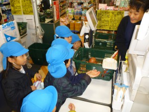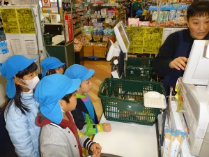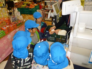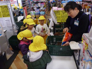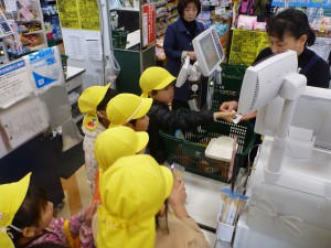 レジでは、さすがに緊張気味の子どもたち
