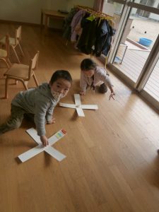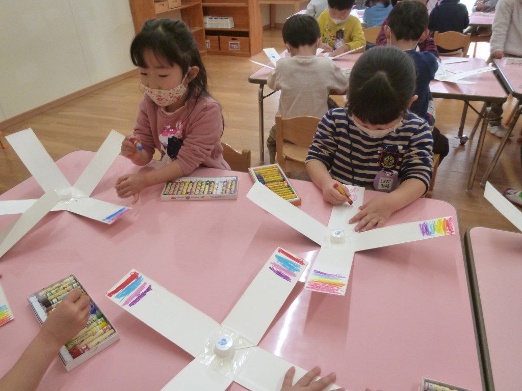 年中さんは、牛乳パックを切り開いて作ったコマです。