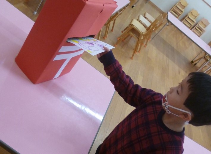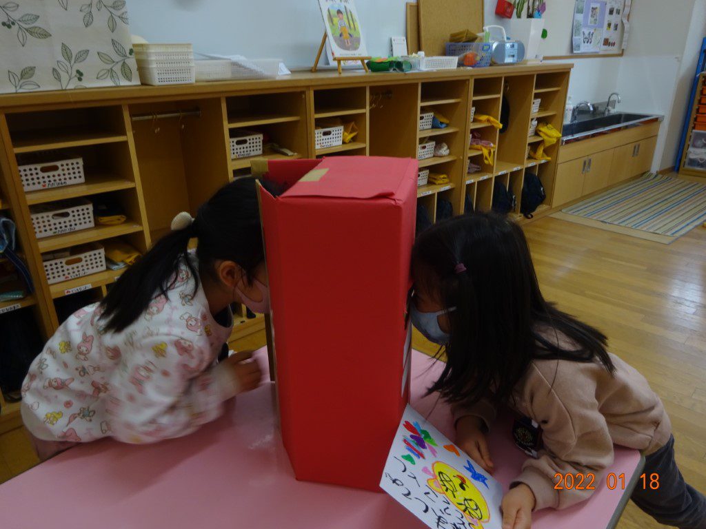 ロッカーの上に、大きな赤いポストを見つけ、大騒ぎ