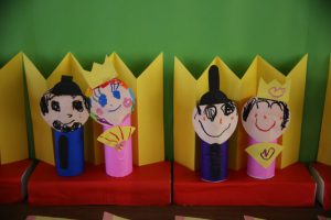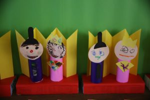 トイレットペーパーの芯に、折り紙の着物を巻き付け、