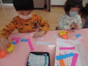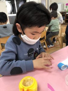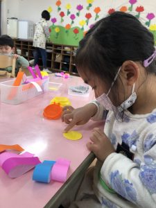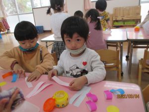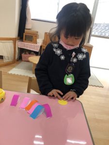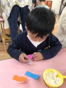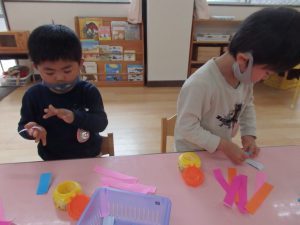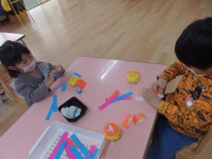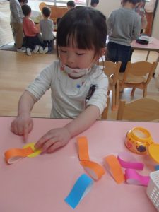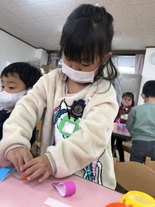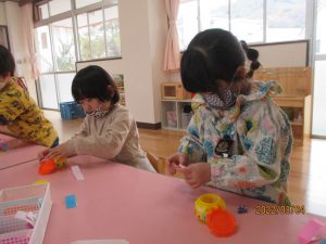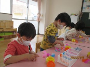 2022.03.14 年少 年長 こっそりプレゼント製作(年少) 2022年 3月 3月に入って、どこのクラスでもこっそり…の活動があったようです。 年少さんのクラスでは…きれいな棒状の折り紙で、しずく?型……? みんな黙々……心の中を覗いてみよう… ? 大きいお兄ちゃん お姉ちゃん学校に行っても、元気でね! ? なるほど…こっそり、年長児へのお別れのプレゼントだったのですね… 心がこもっているはずです? 一覧に戻る
