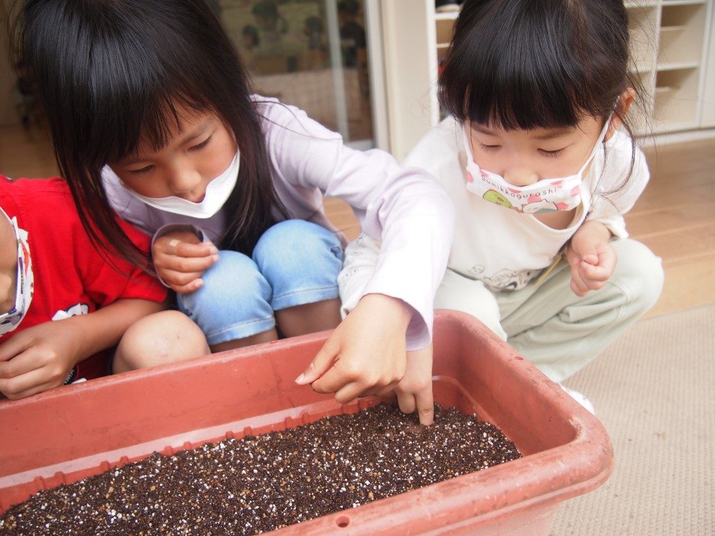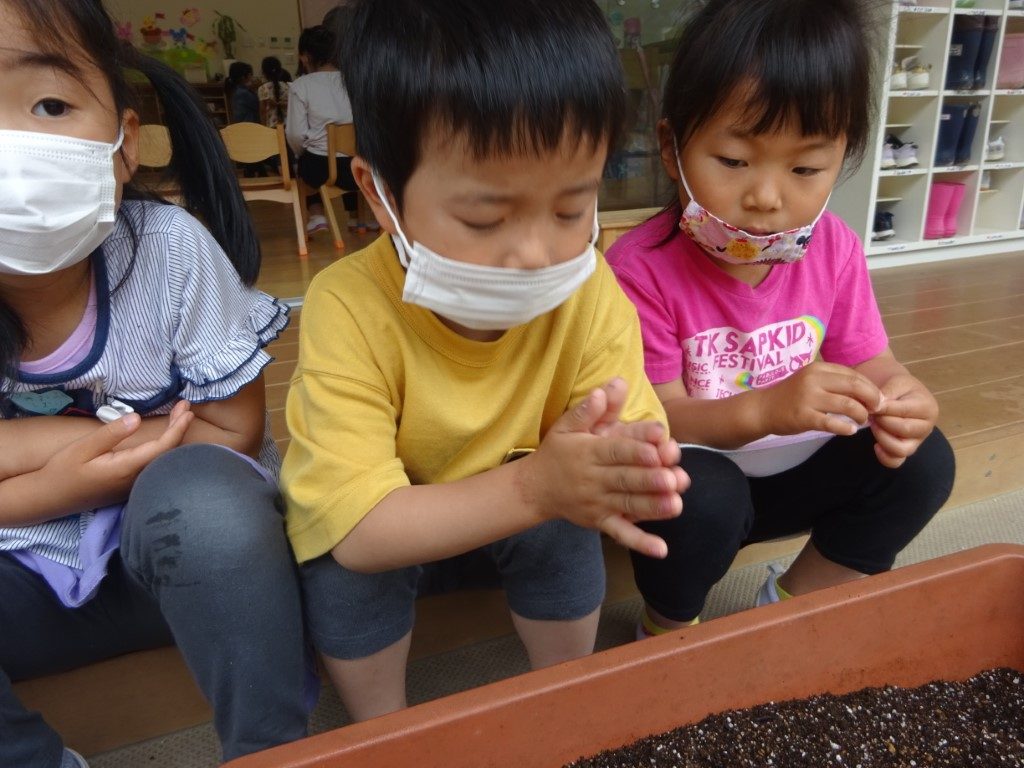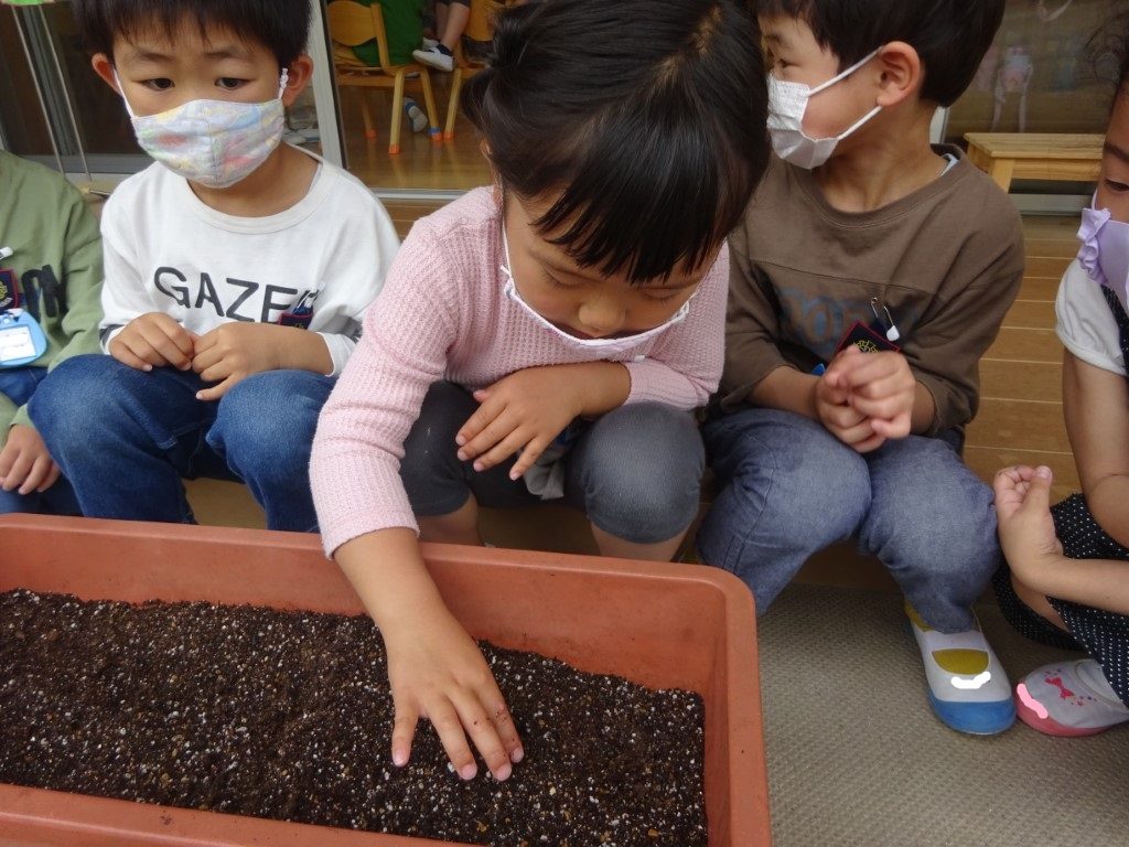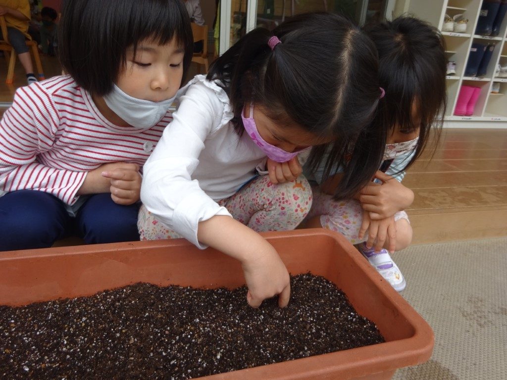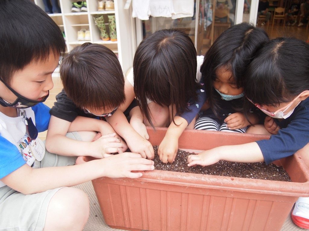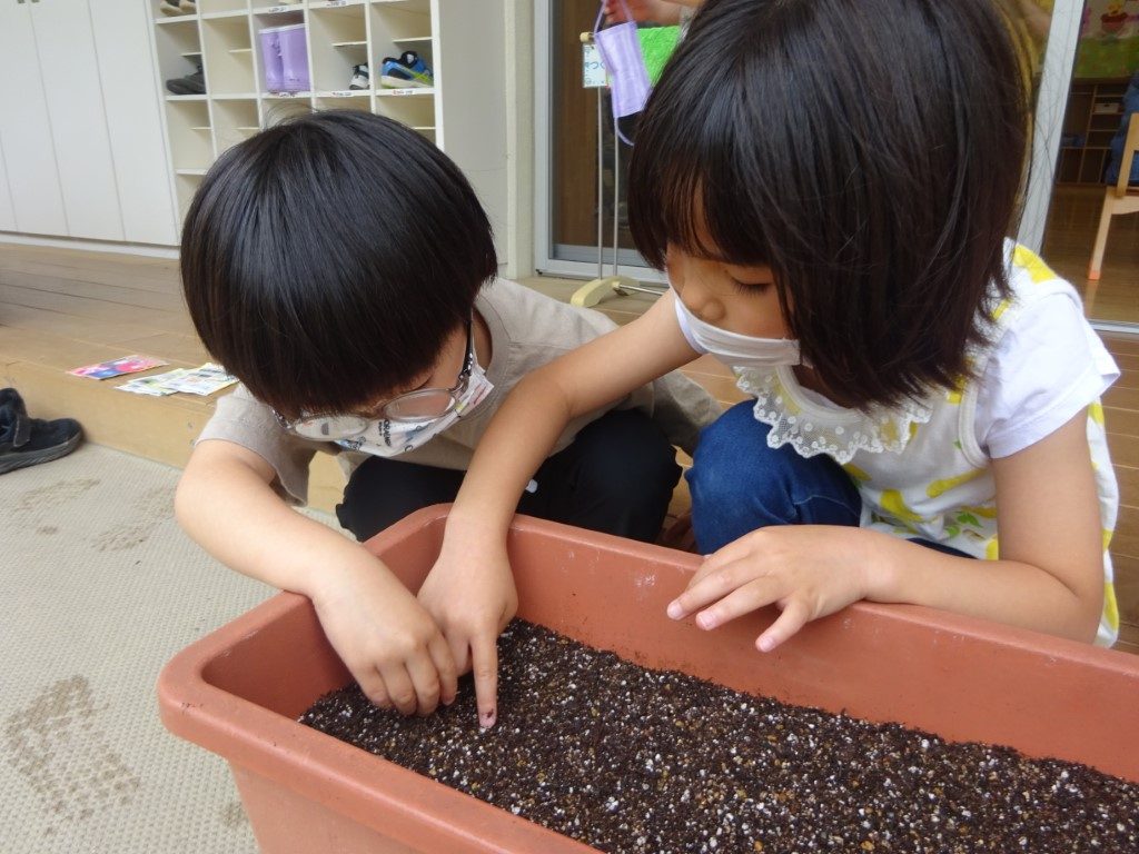 2022.05.18 年長 自然 朝顔の種まきをしたよ(年長) 2022年 5月 各クラスで朝顔の種まきをしました。 匂いを嗅いだり 形を見たり じっくり観察した後、プランターへ植えました☆ 指先で穴をあけて 優しく砂をかぶせ 大きくなりますように♡ 芽が出るのを今か今かと心待ちにしています。 ※熱中症対策として、また、活動に応じてマスクを外していることもあります。 一覧に戻る