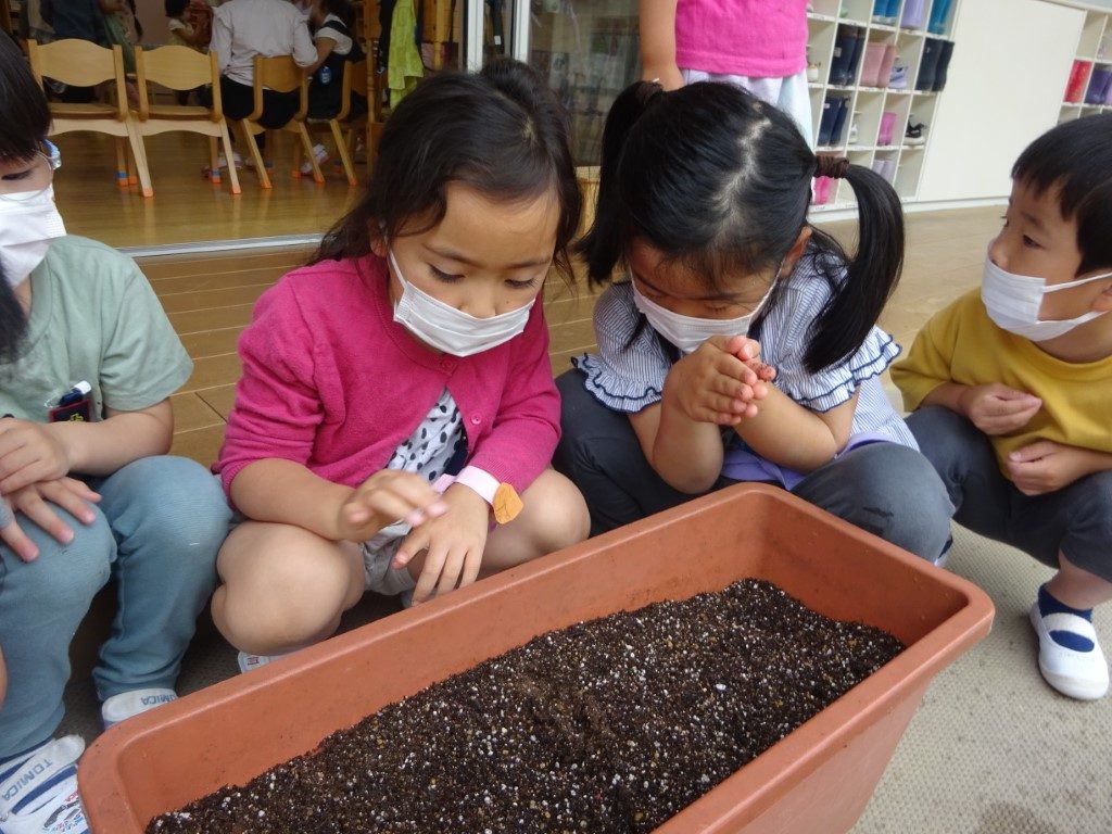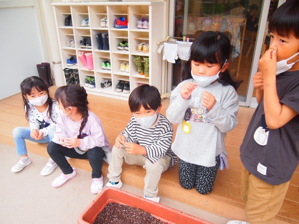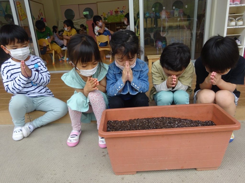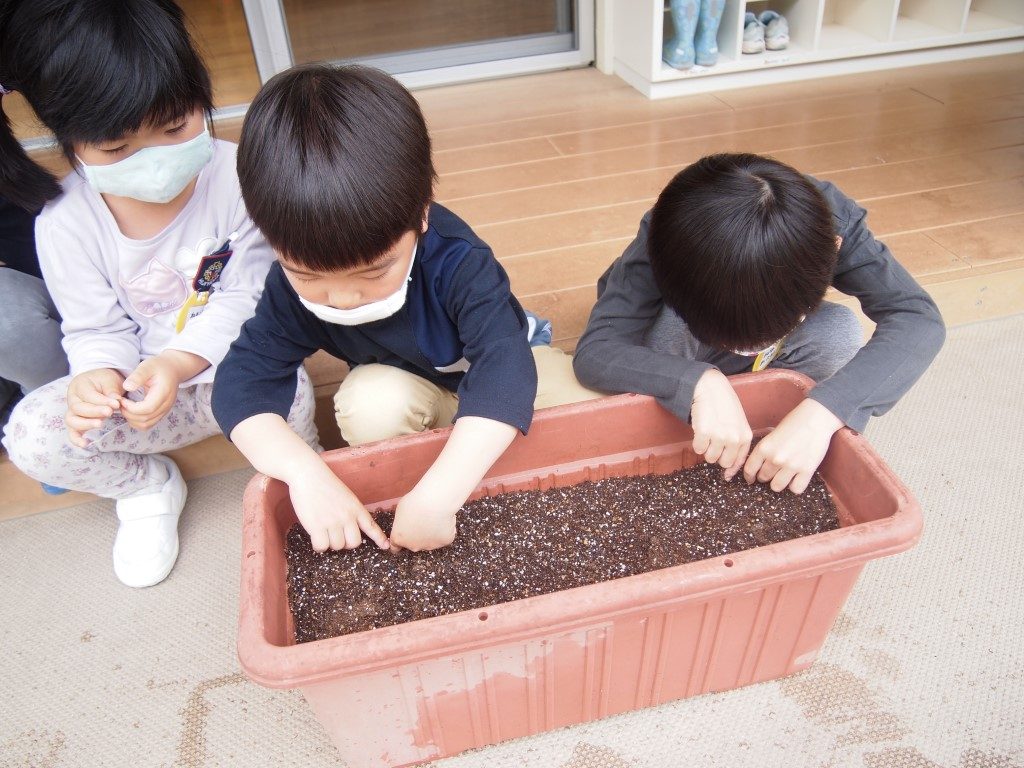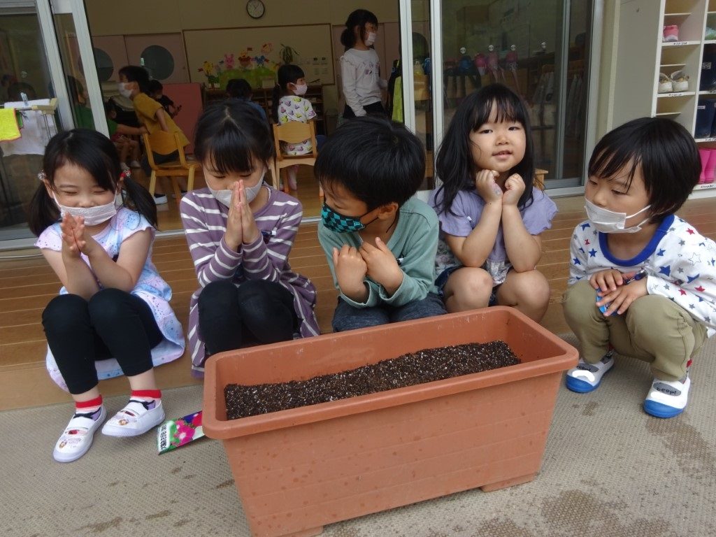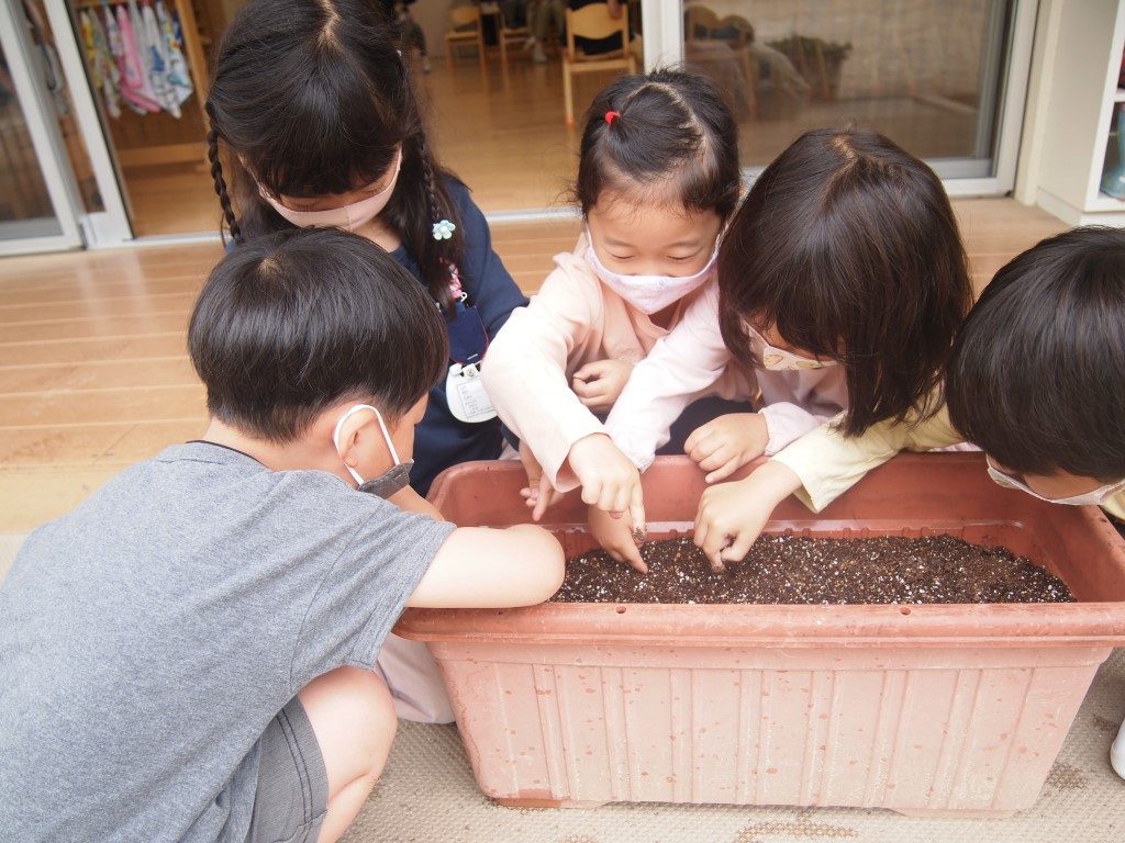 2022.05.18 年長 自然 朝顔の種まきをしたよ(年長) 2022年 5月 各クラスで朝顔の種まきをしました。 匂いを嗅いだり 形を見たり じっくり観察した後、プランターへ植えました☆ 指先で穴をあけて 優しく砂をかぶせ 大きくなりますように♡ 芽が出るのを今か今かと心待ちにしています。 ※熱中症対策として、また、活動に応じてマスクを外していることもあります。 一覧に戻る