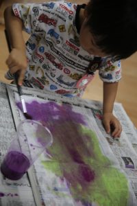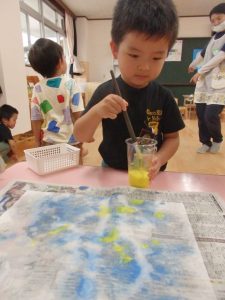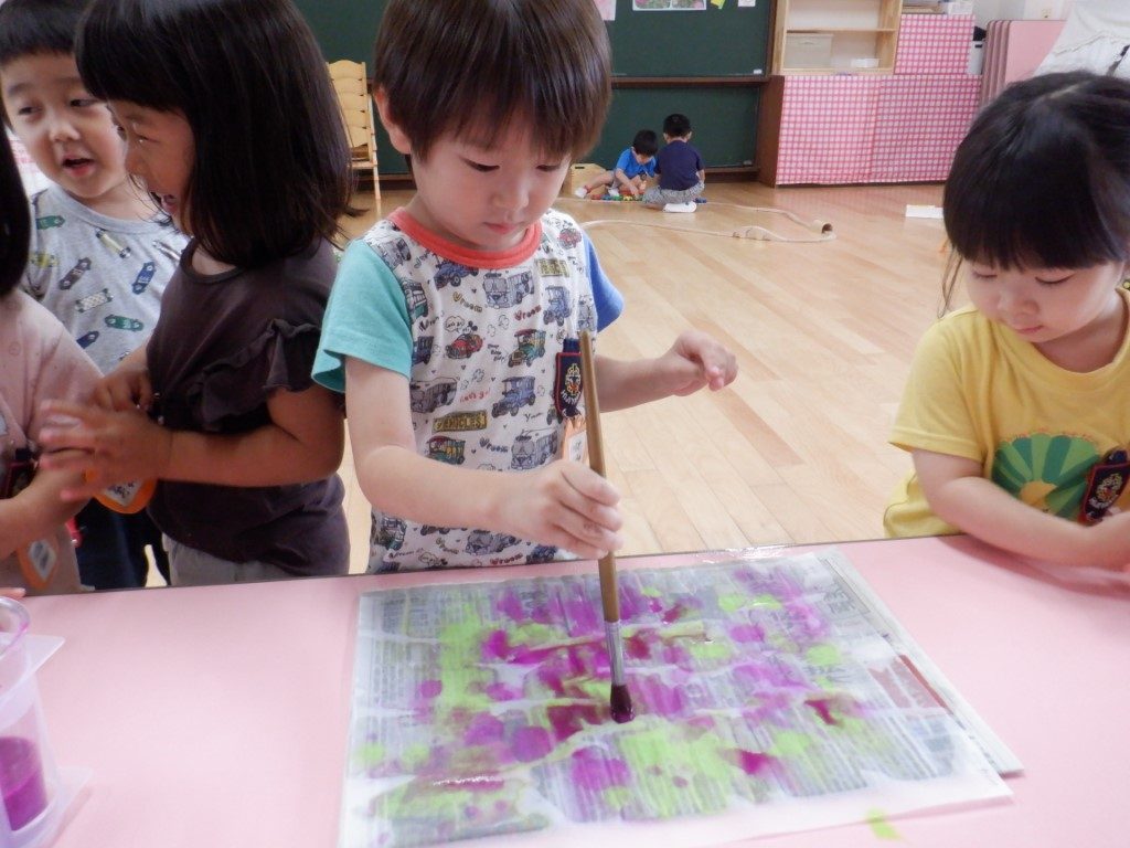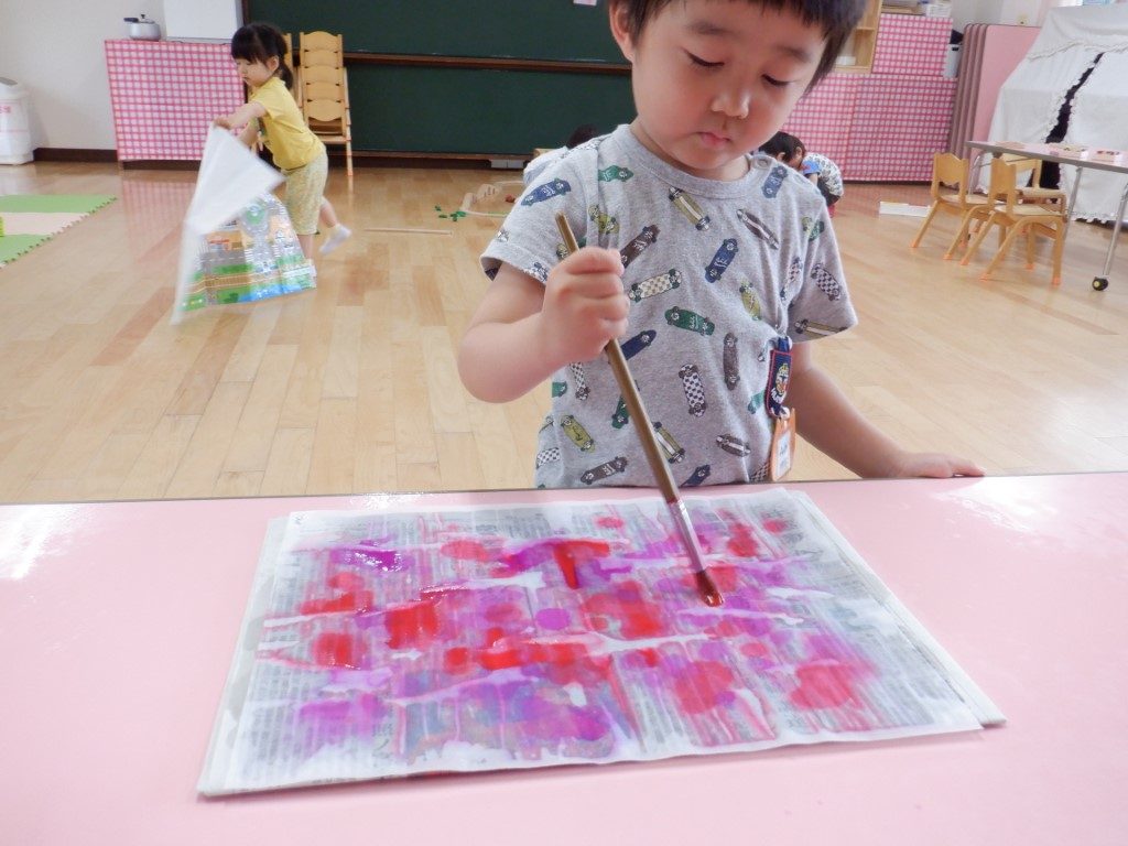 年少は、戸外で思い切り 絵の具遊びをしました。