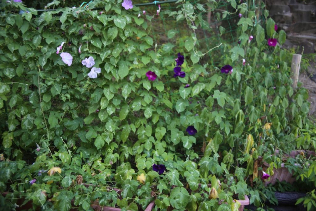 年中・年長児の植えた朝顔の花が咲き始めています。