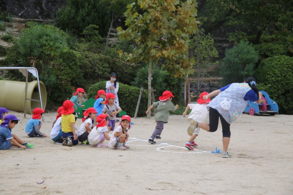 年少さん、広い園庭で体をしっかり動かして