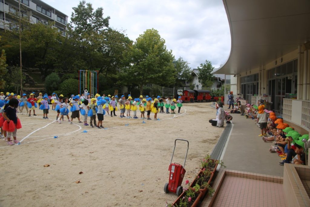 年少さん、初めて見る 年長さんのポンポン。