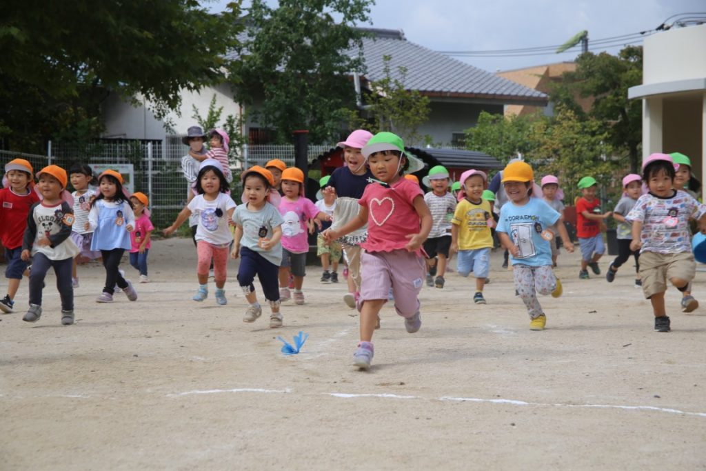戸外でかけっこを始めるところでした。