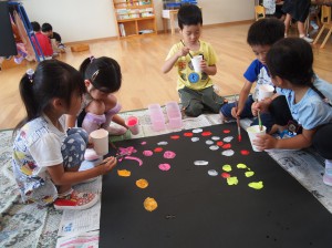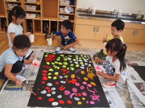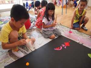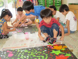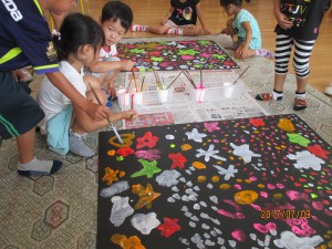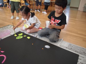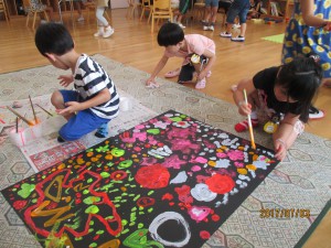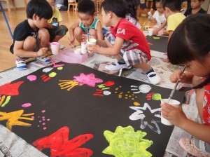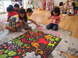 筆を貸し合ったり、こぼれた絵の具を拭いたりと