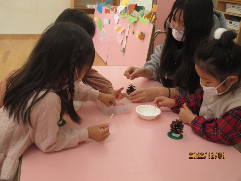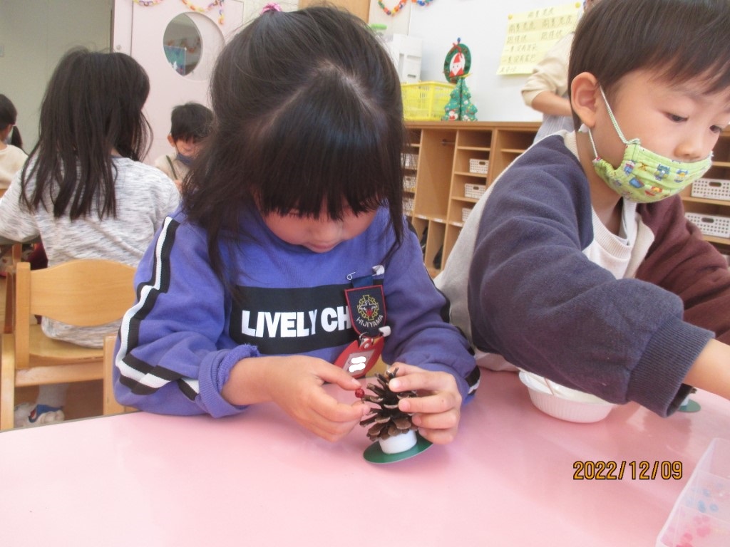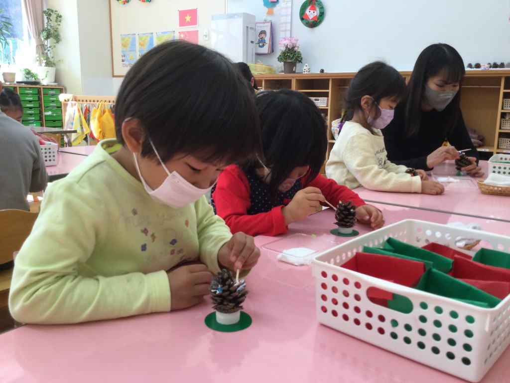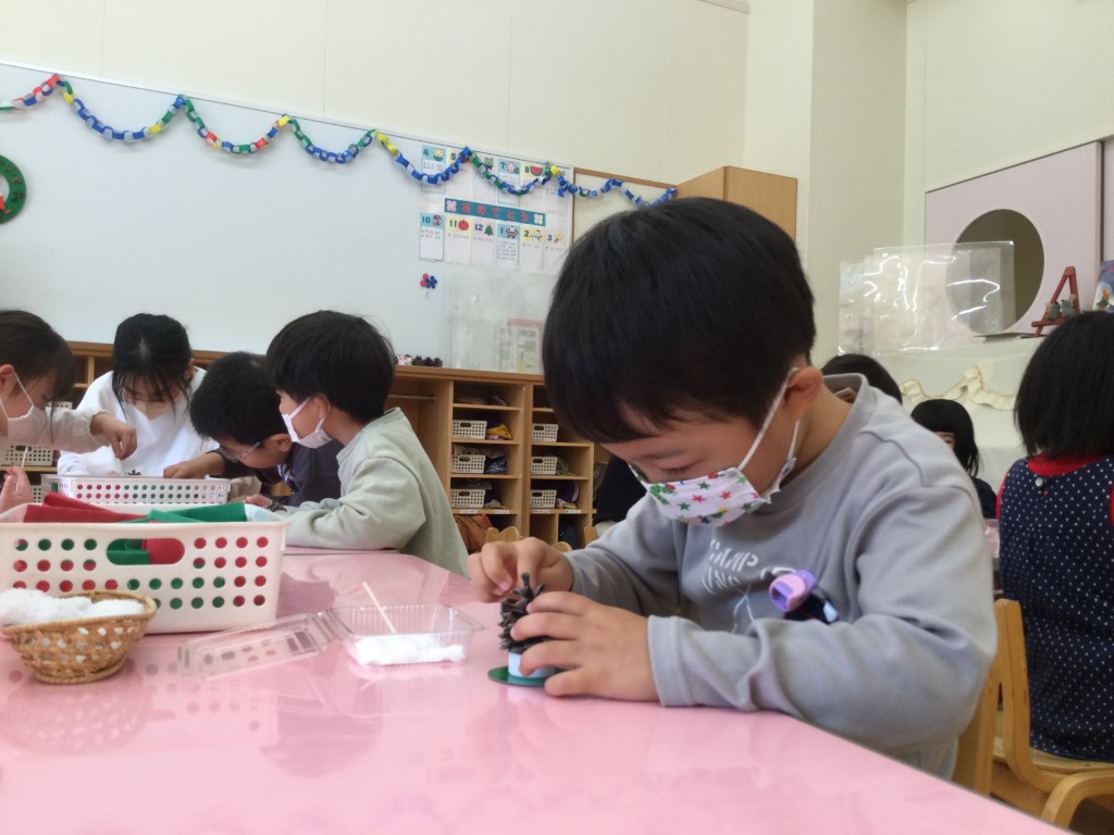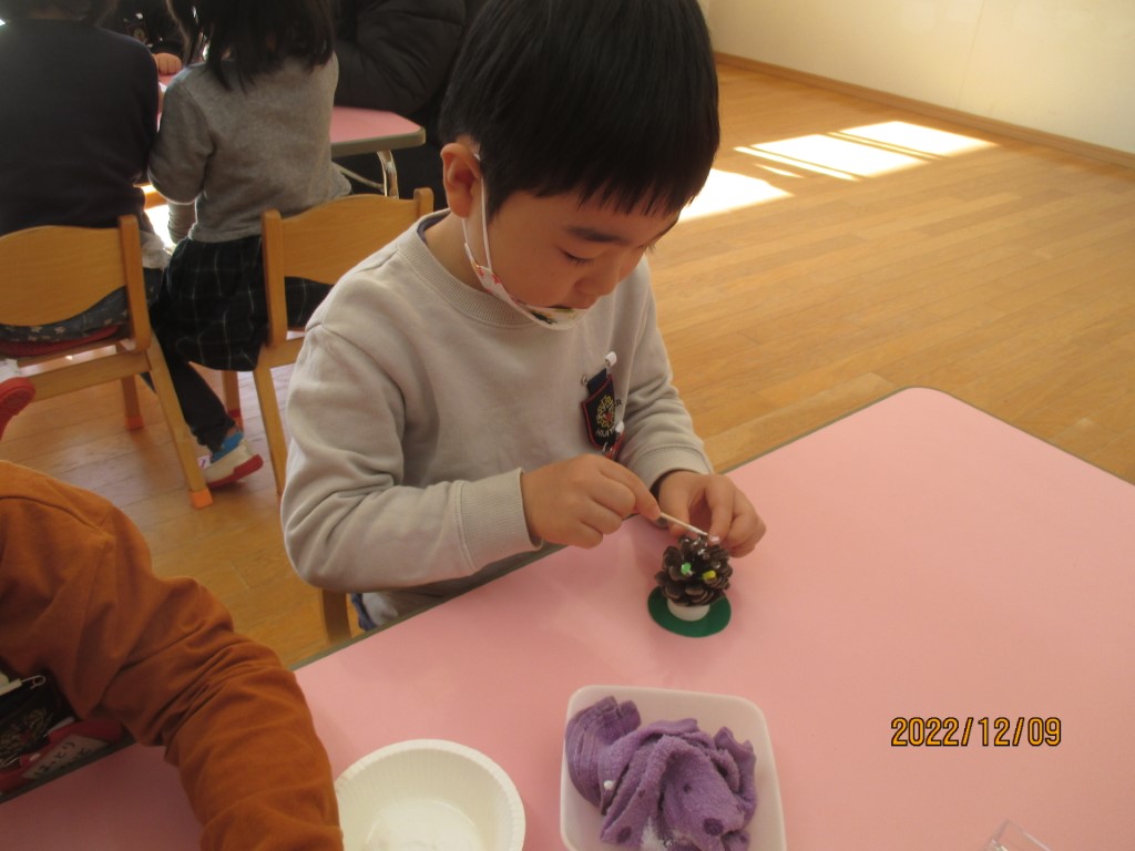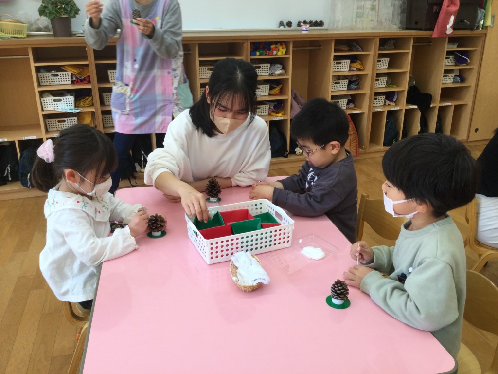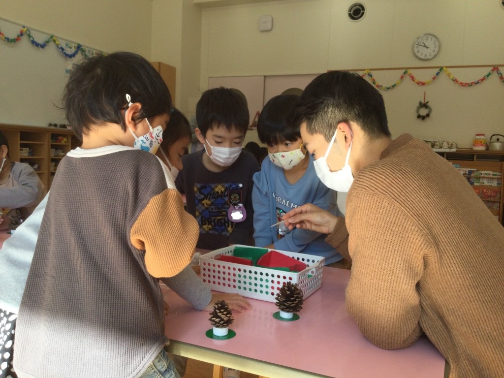 完成後は、みんなでまつぼっくりツリーを見せ合いました。