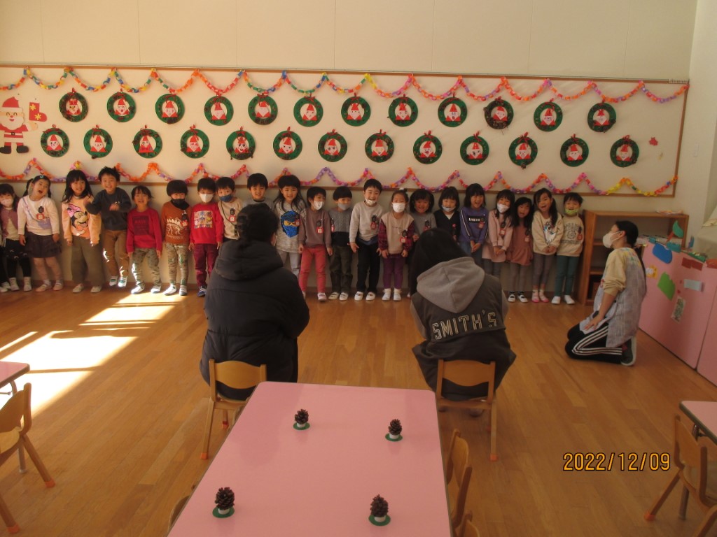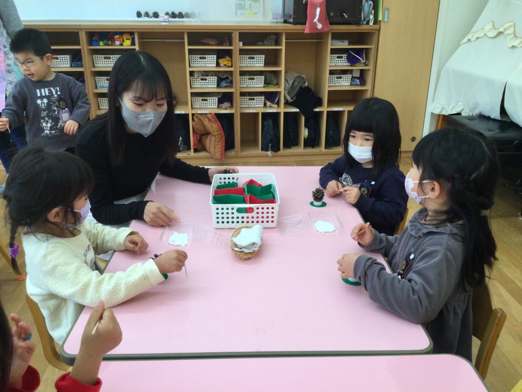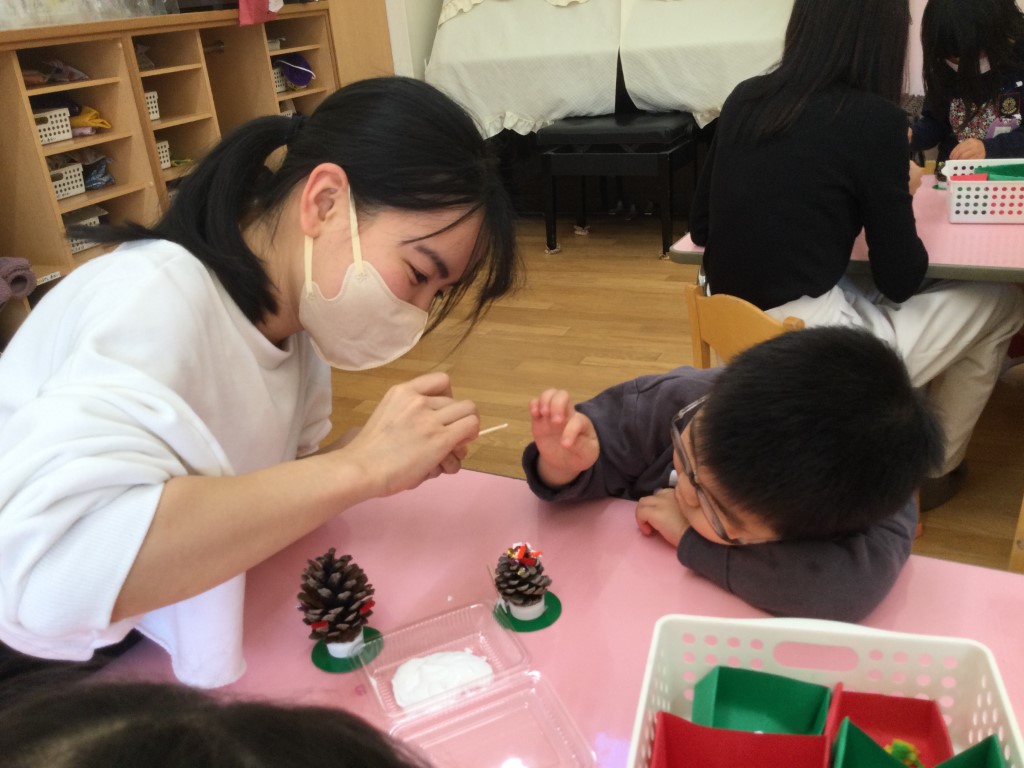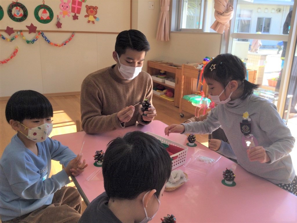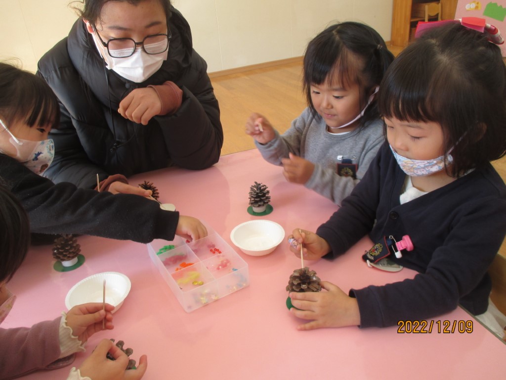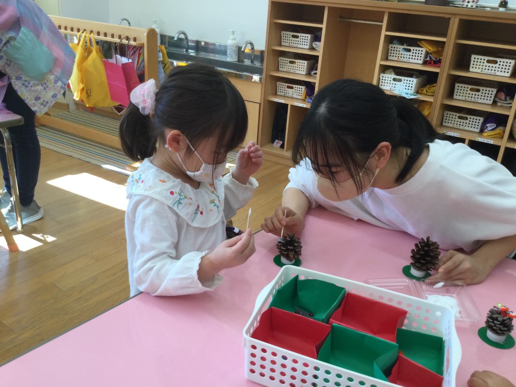 完成後は、みんなでまつぼっくりツリーを見せ合いました。
