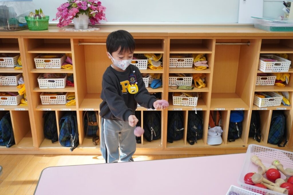 「1人で2個投げるのは難しいから1つずつ持ってみよう!」