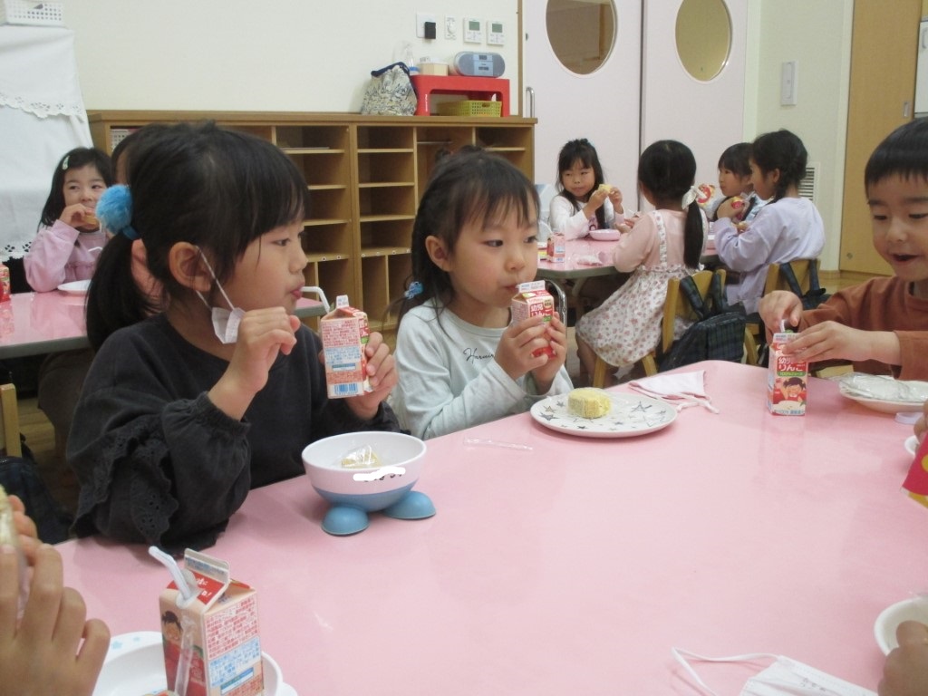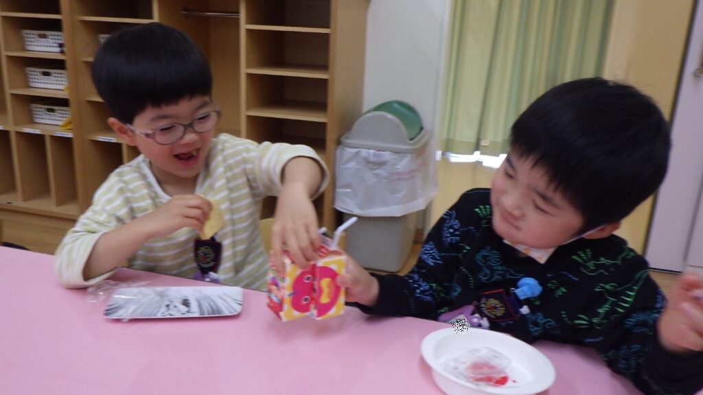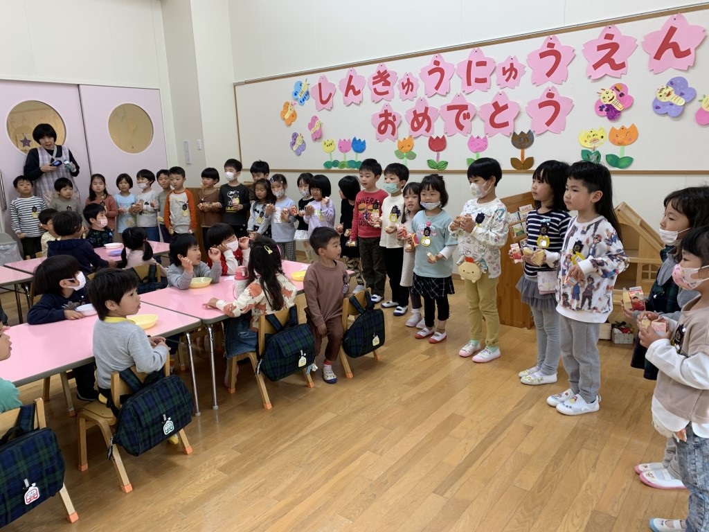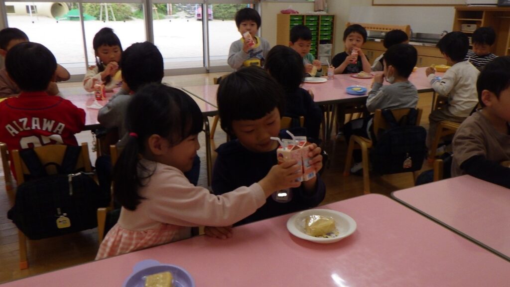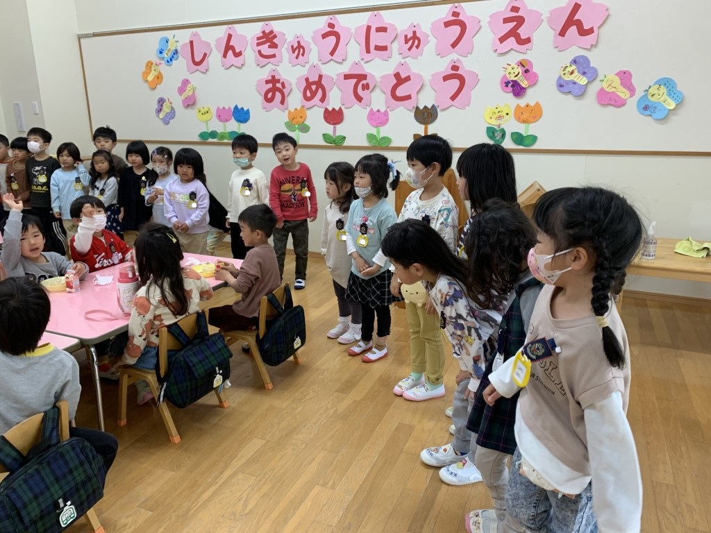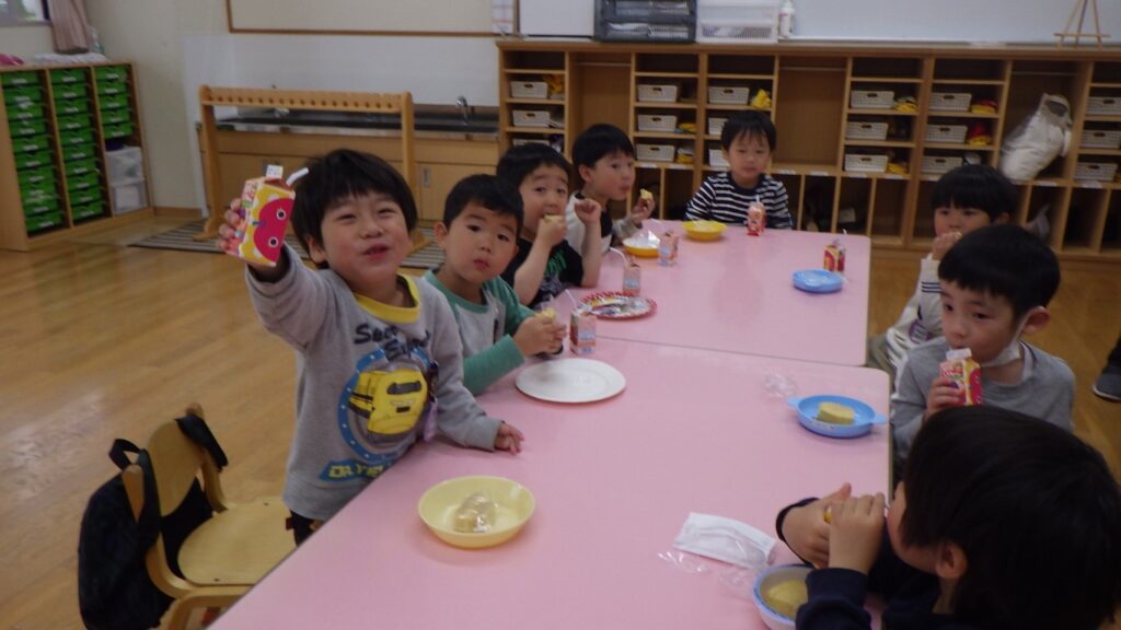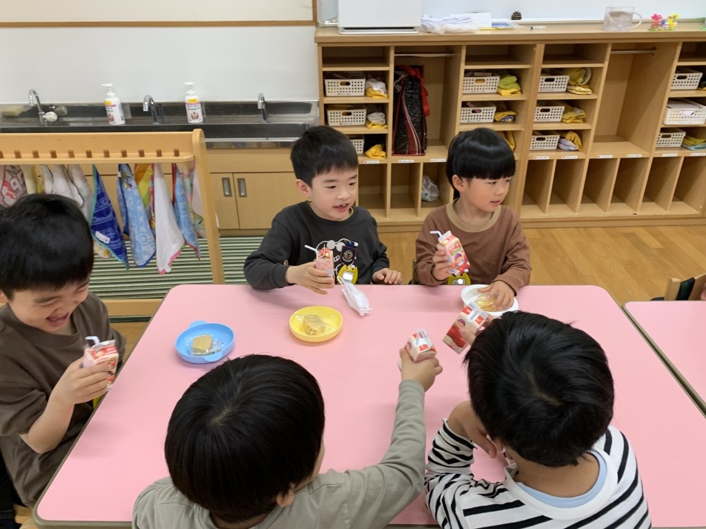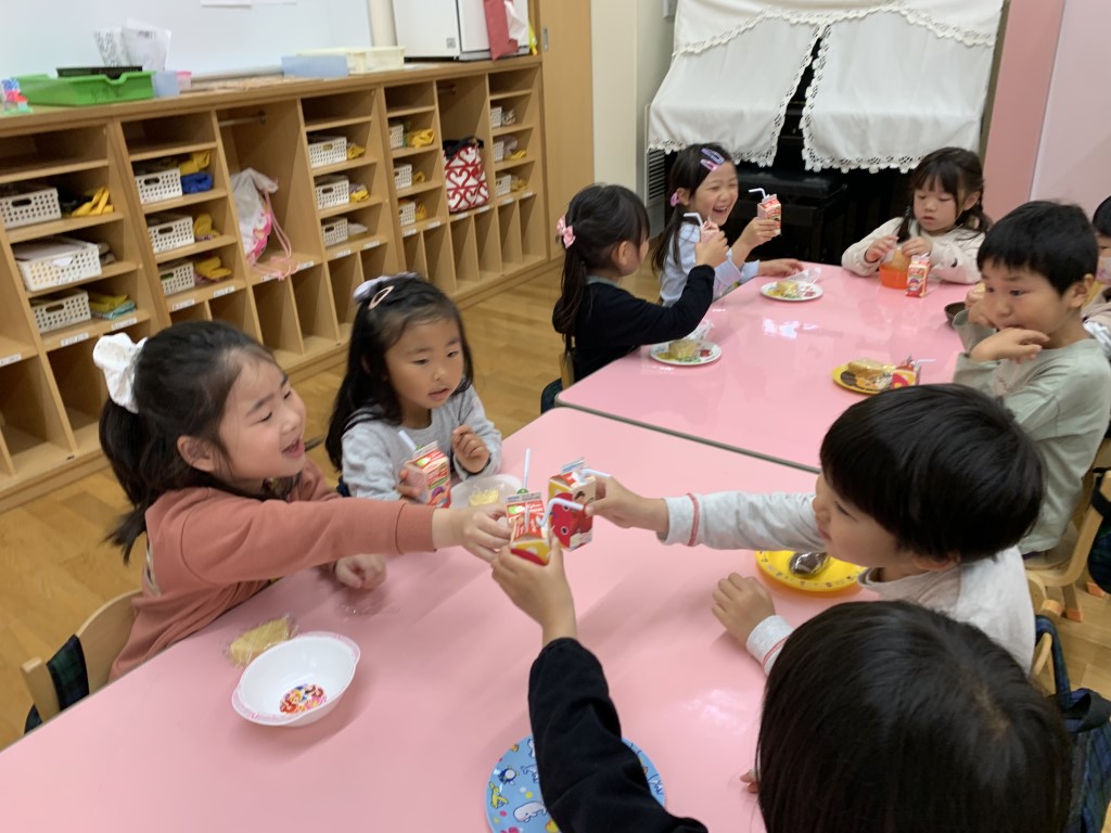 「かんぱいしよ~」と幼稚園のお誕生日をお祝いしました。
