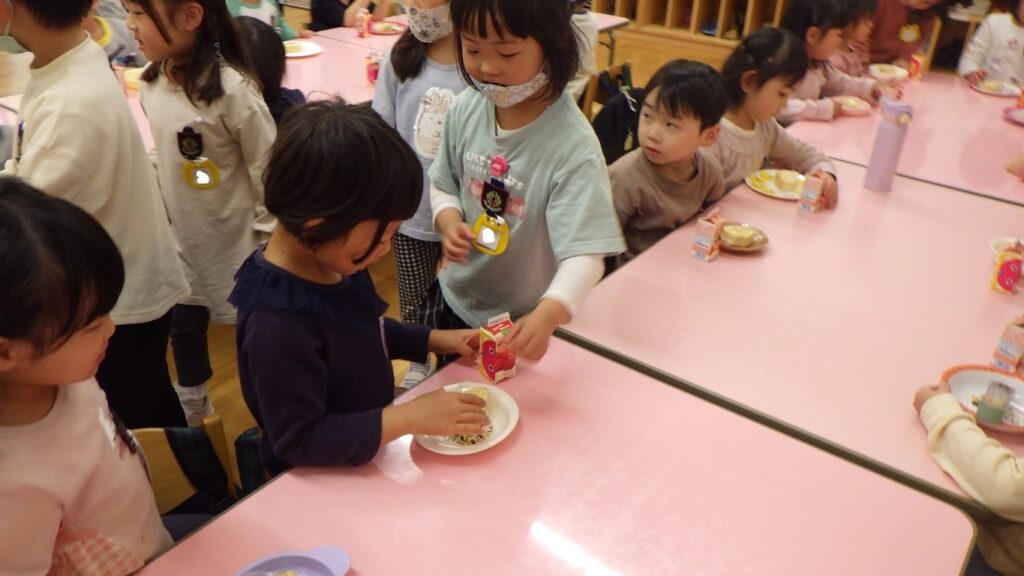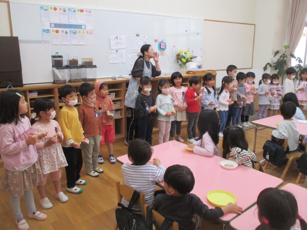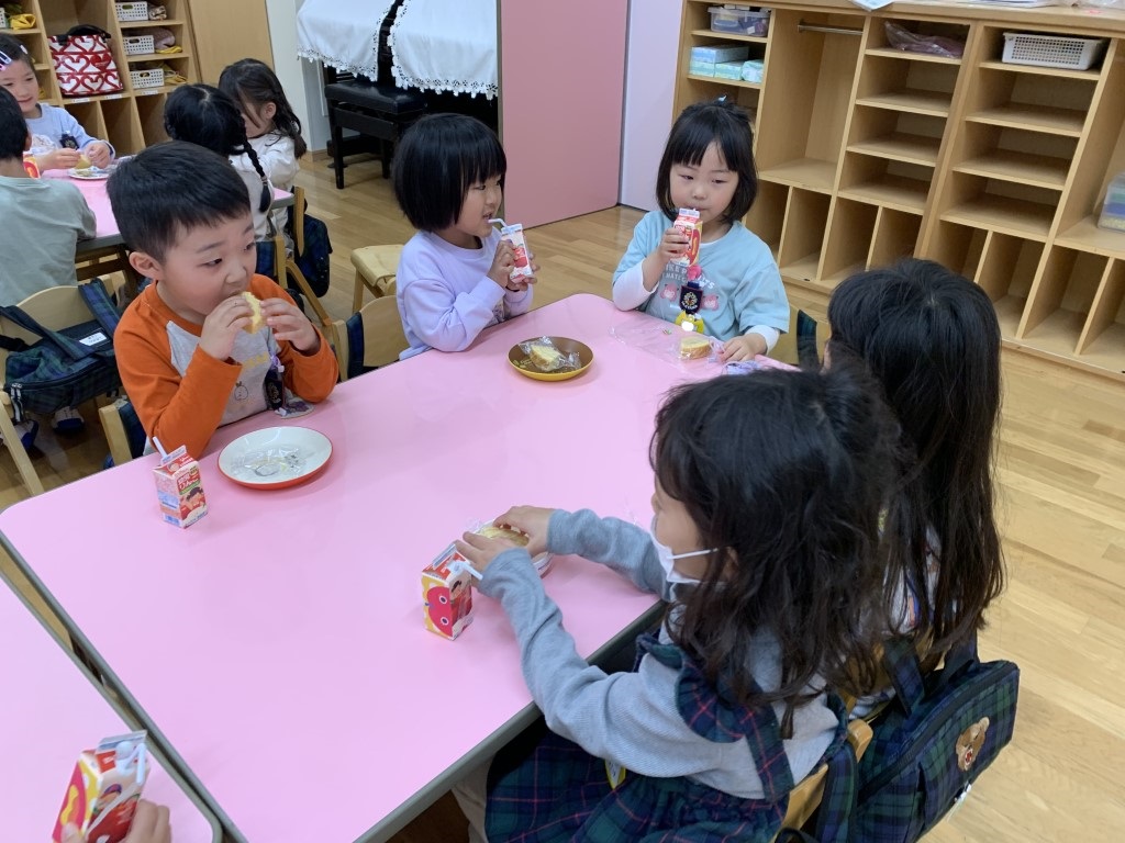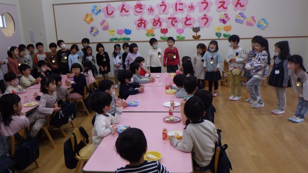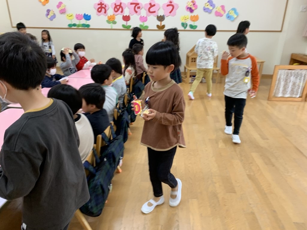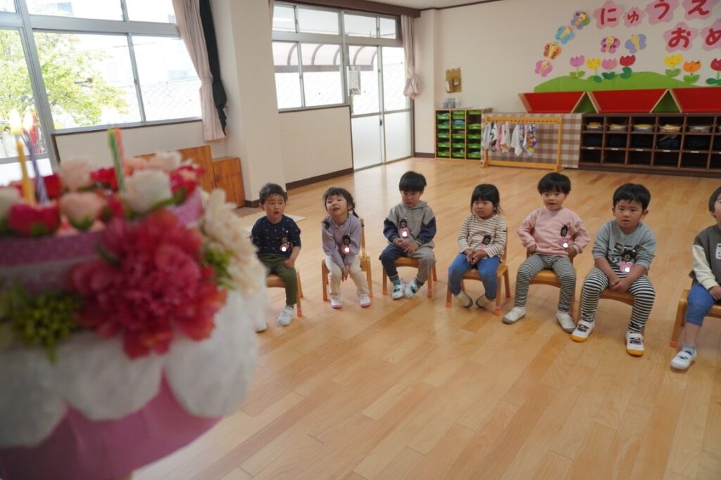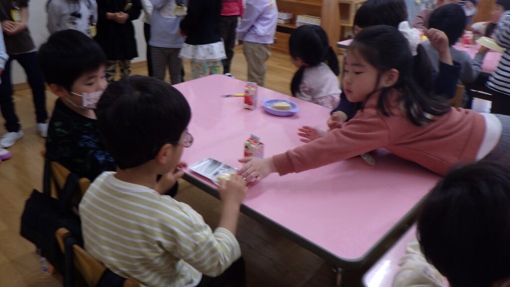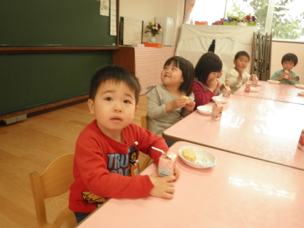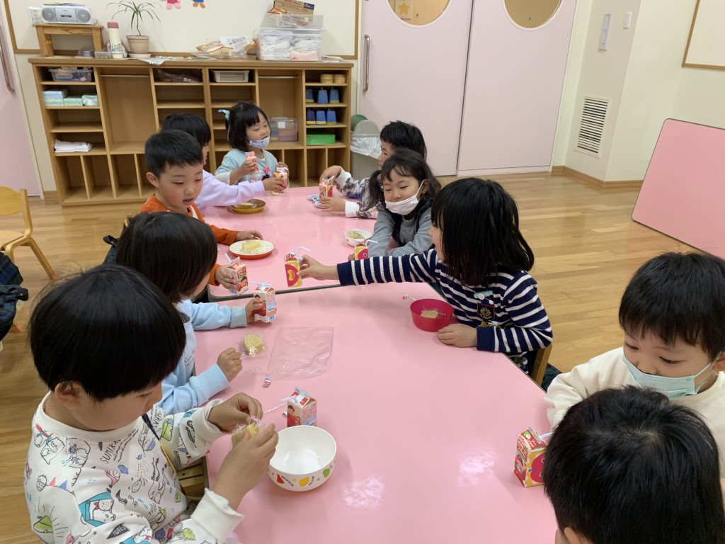 「かんぱいしよ~」と幼稚園のお誕生日をお祝いしました。