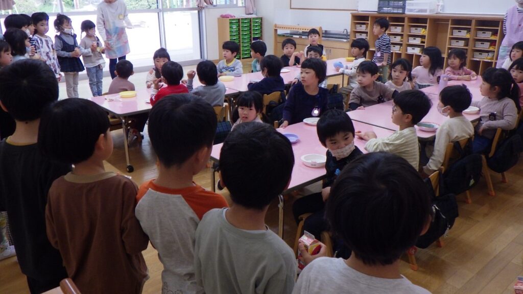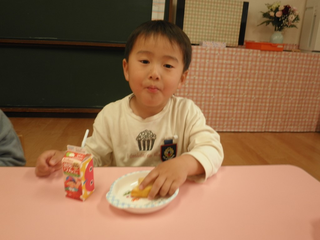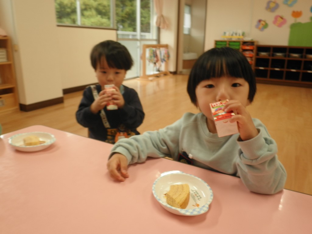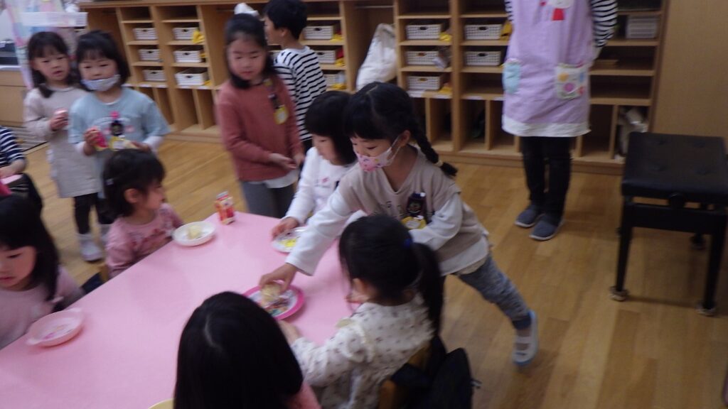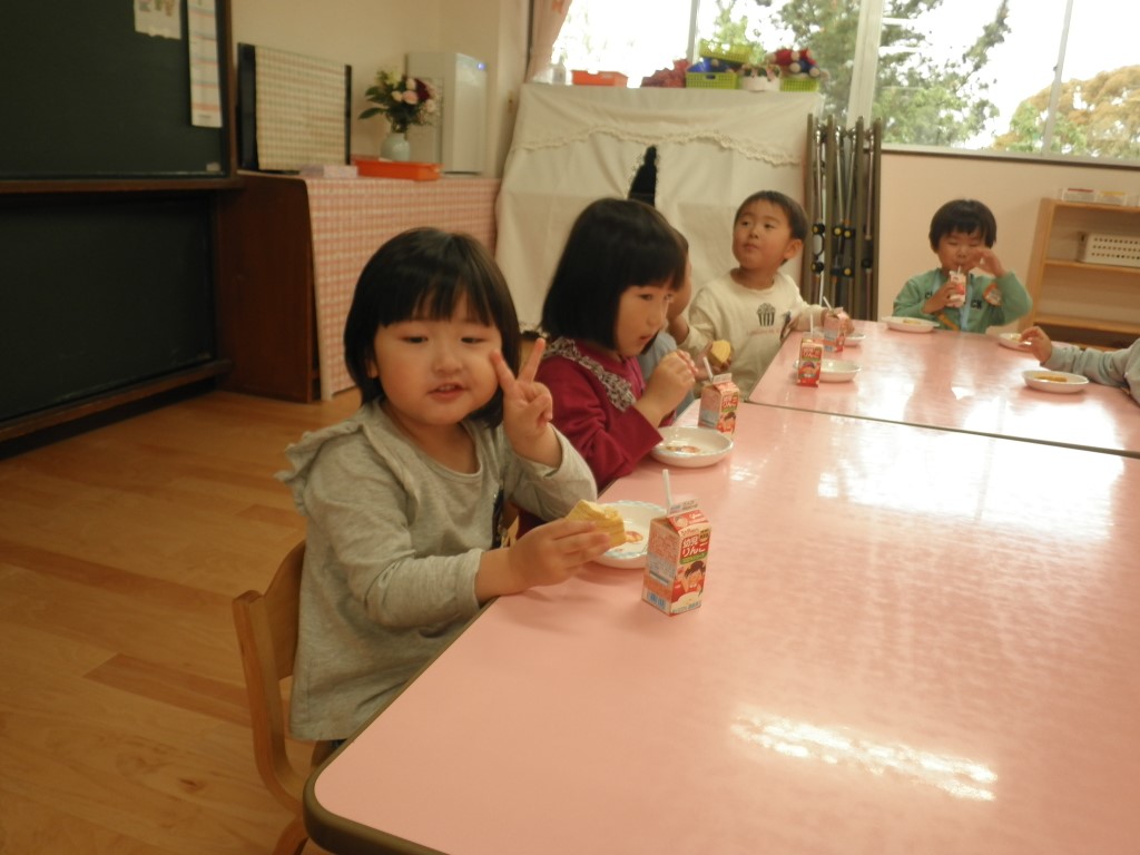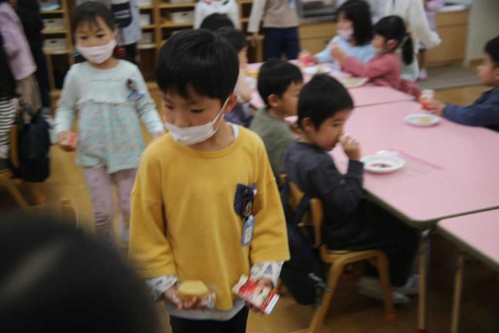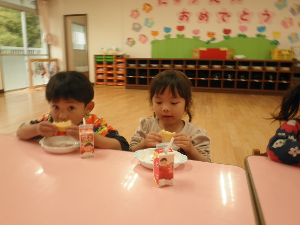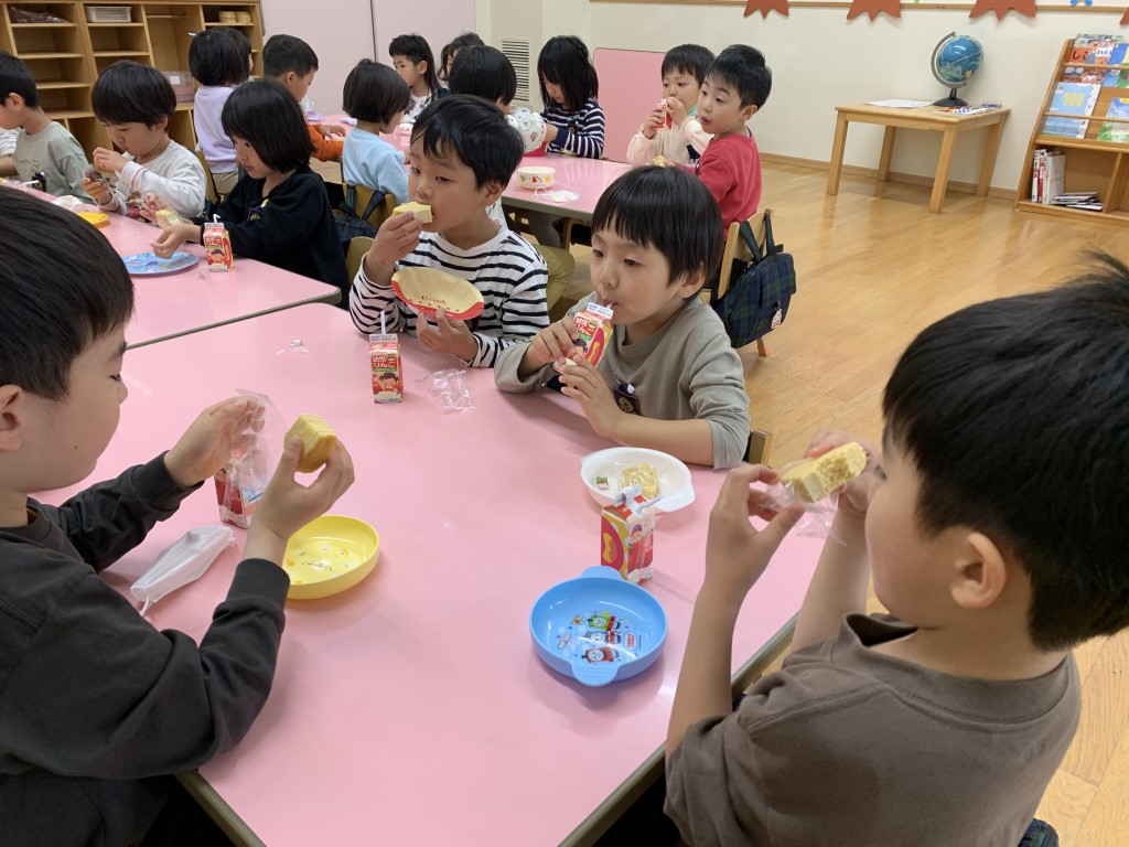 「かんぱいしよ~」と幼稚園のお誕生日をお祝いしました。