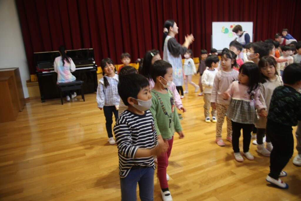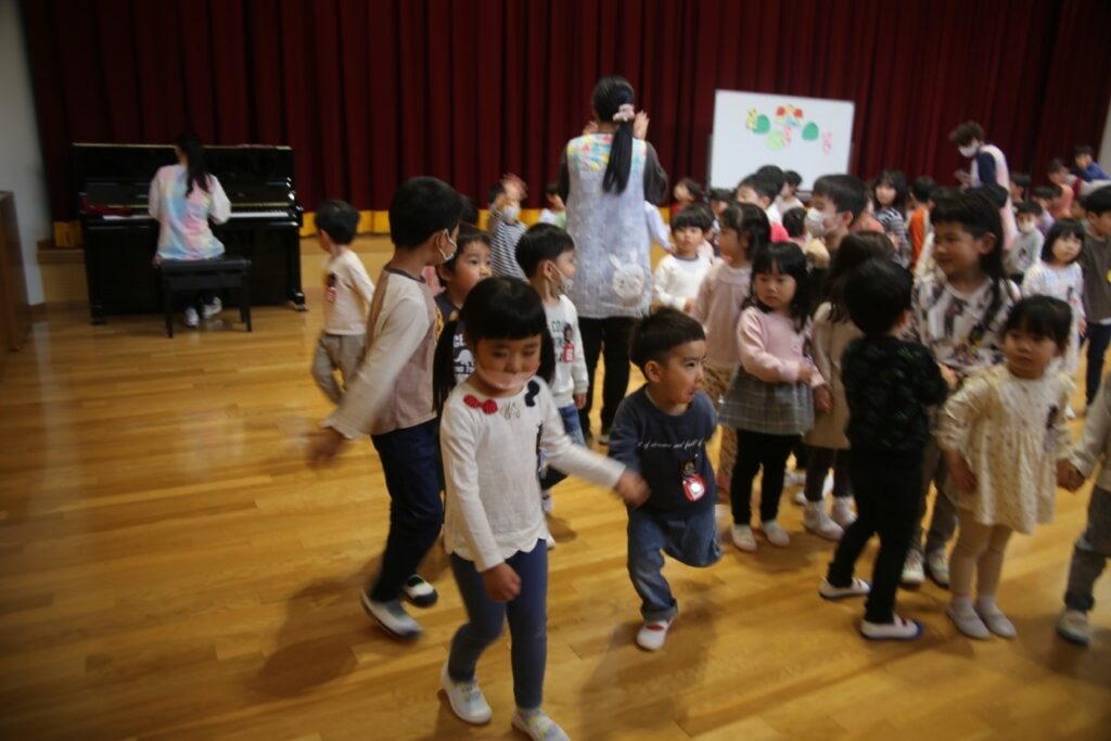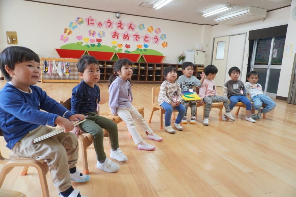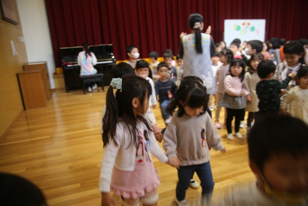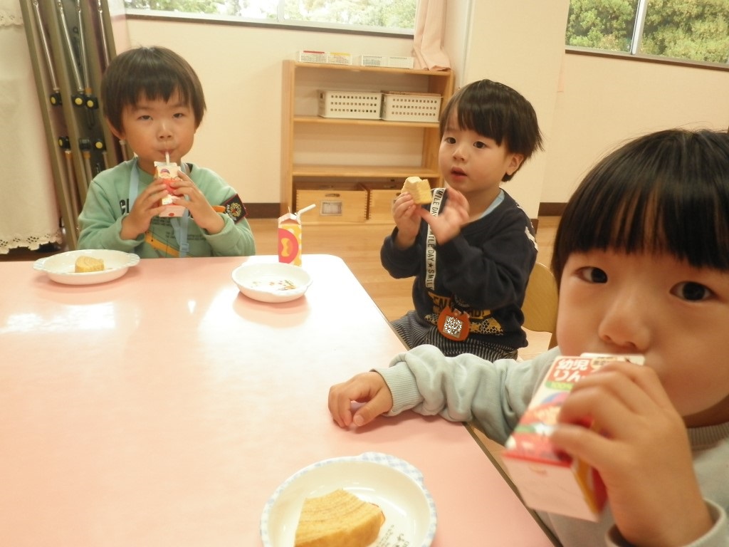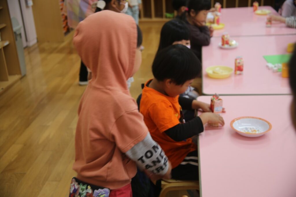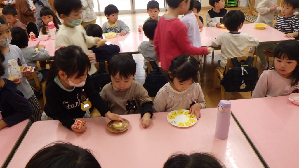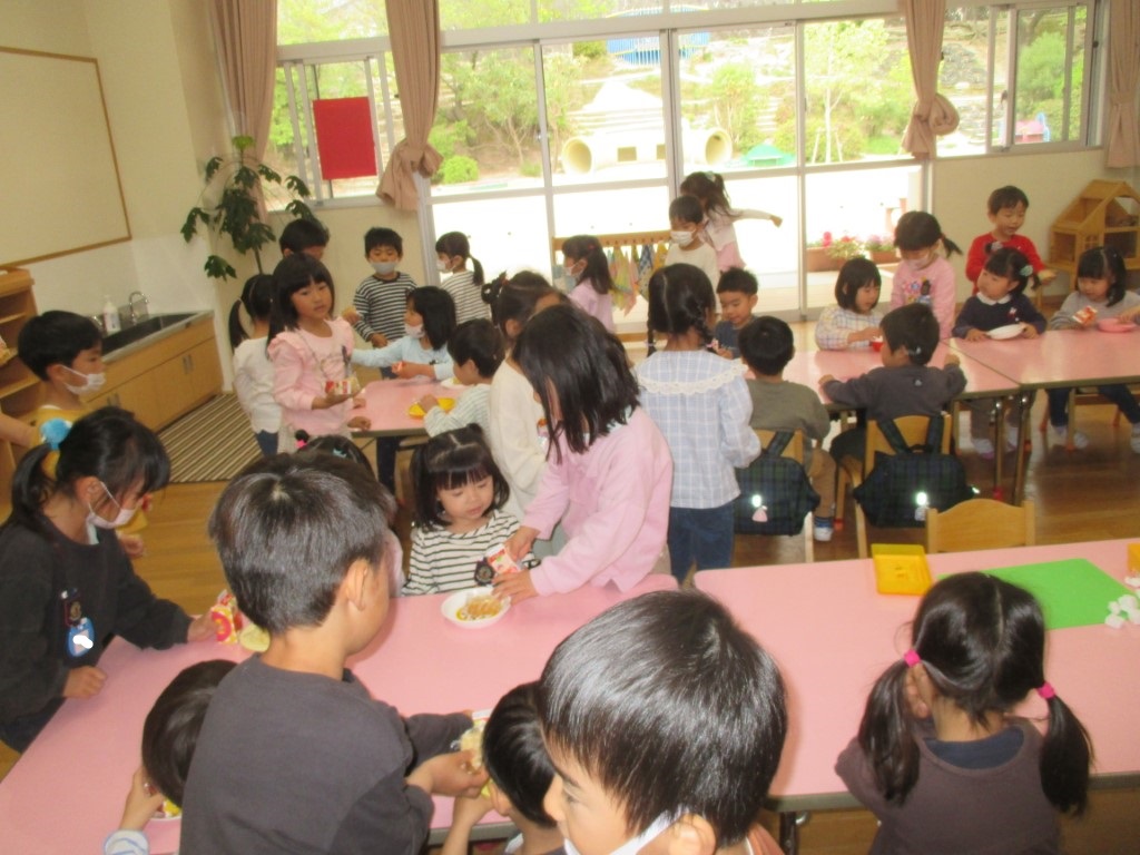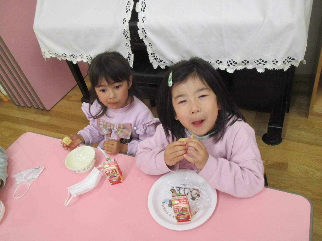 「かんぱいしよ~」と幼稚園のお誕生日をお祝いしました。