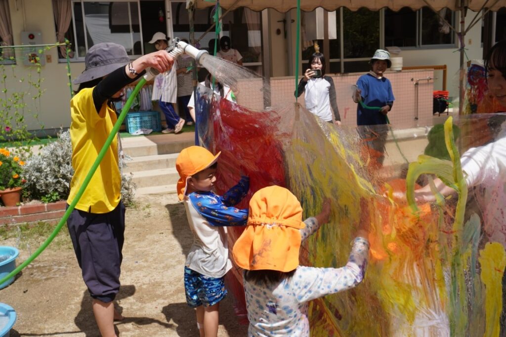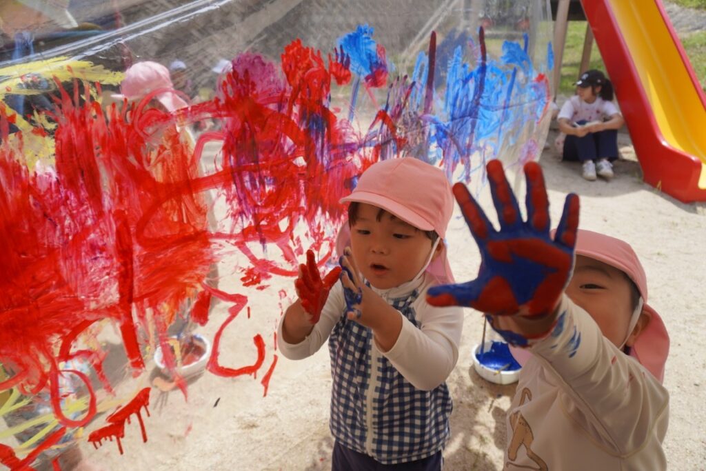 ピンと張った透明ビニールシートに、絵の具でぬりぬり