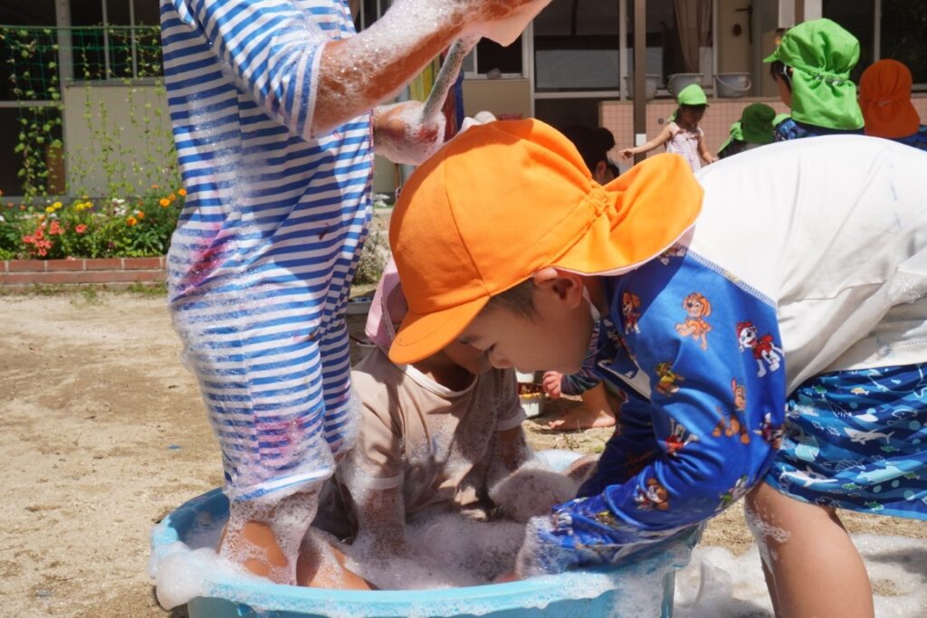 手のひらの絵の具を洗うと、ほら、泡だらけ~~