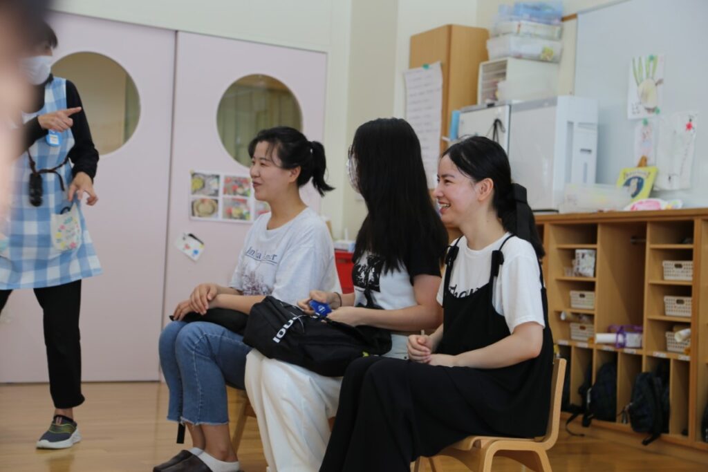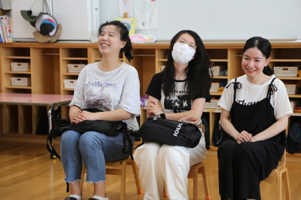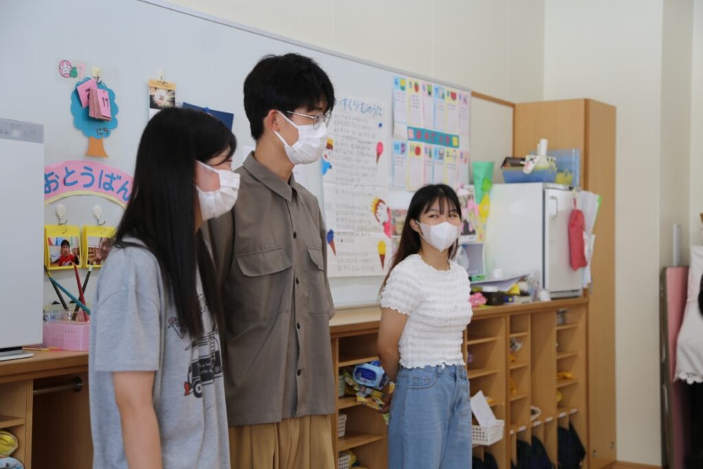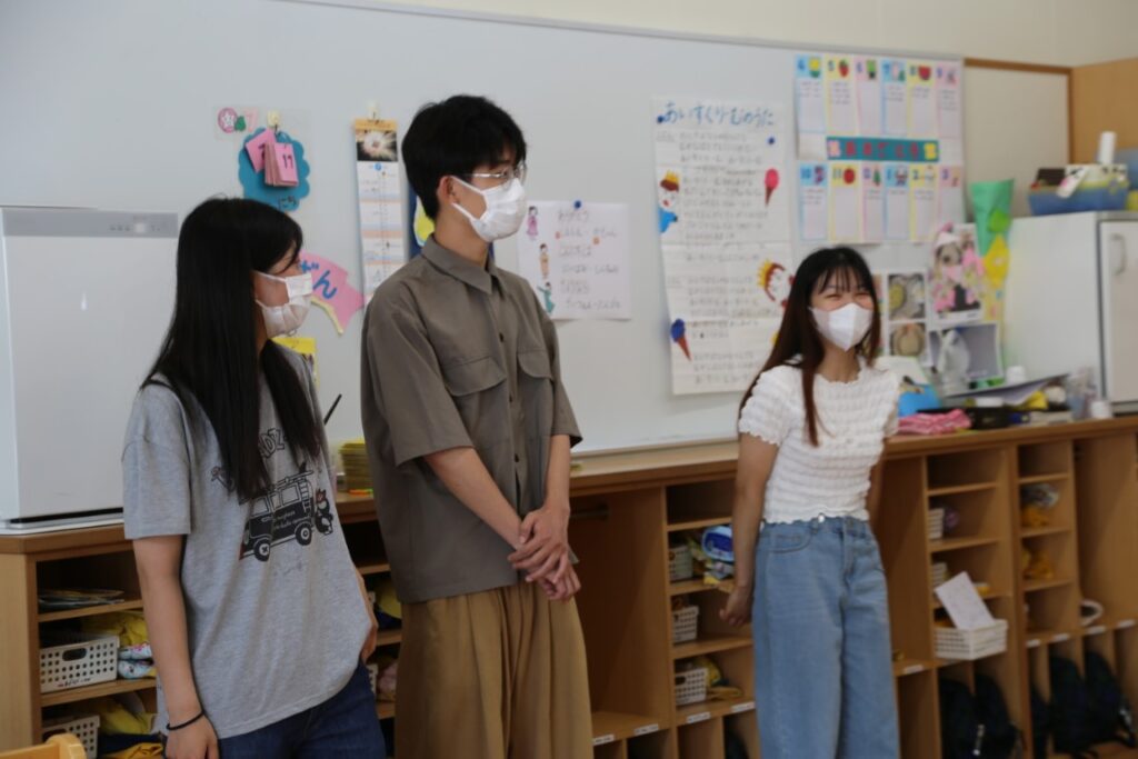 「今から、学生さんが、みんなの背中に形を描くよ」