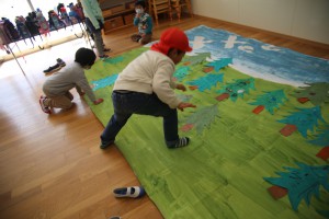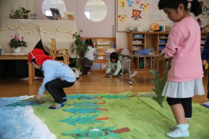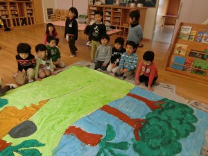 劇遊びに必要な大きな背景画はどんなものがいいか考えて、