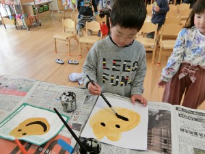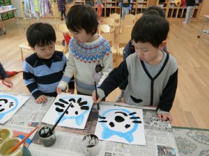 大道具のついたてを作ったり、お面を描いたり、と