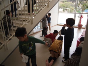 埃だらけの雑巾を誇らしくさえ感じる年長児。