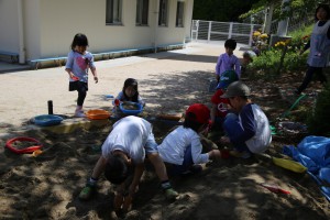 室内の玩具や、戸外での自然の遊び、固定遊具