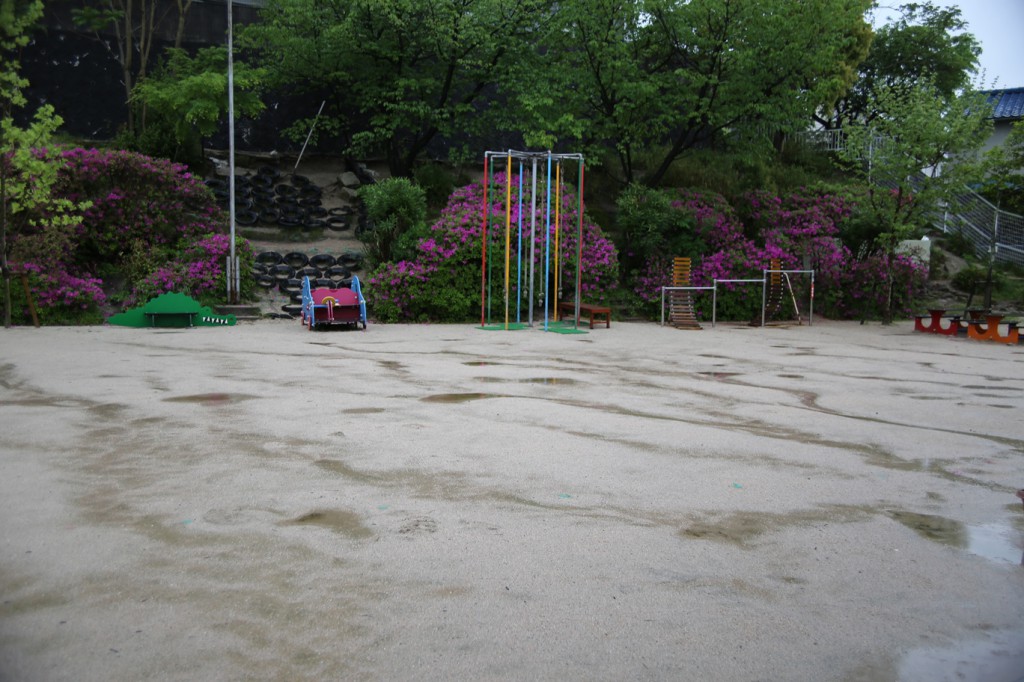 でも、園庭には子どもの掘っていた水路に水が溜まり