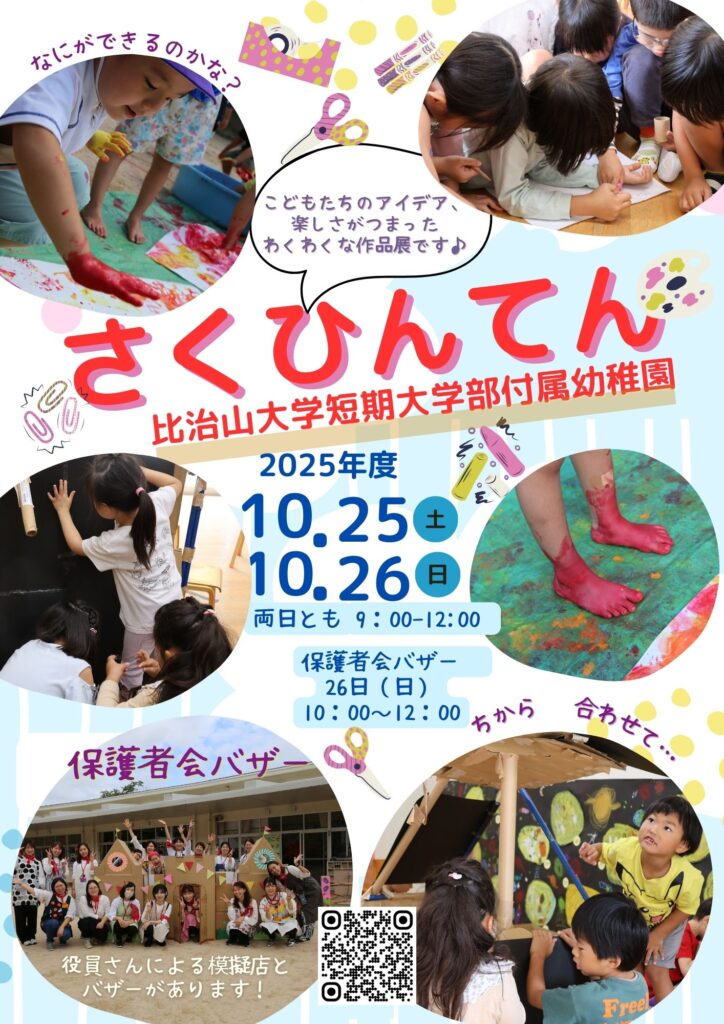 2025.10.11 2025 作品展 2025年 10月25日(土)・26日(日) 作品展(両日とも、9:00~12:00)があります。 26日(日)は、10:00~12:00 保護者会によるバザーもあります。 ぜひ遊びに来てください! 一覧に戻る